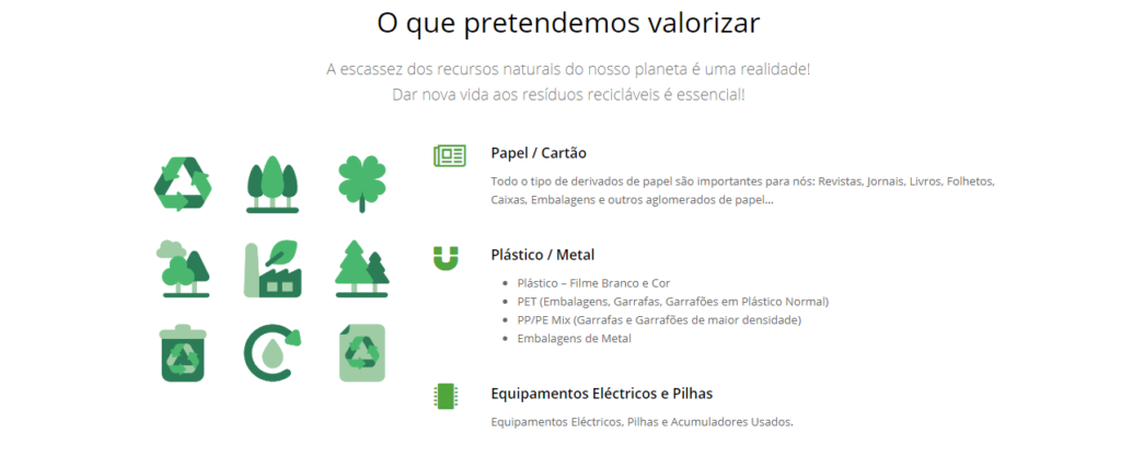 Procedemos à sensibilização de toda a comunidade para a necessidade de reduzir, reutilizar e reciclar e recebemos materiais recicláveis que são separados e acomodados para posterior valorização.